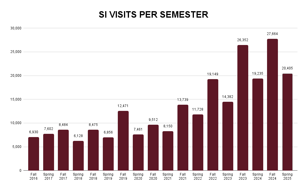 The SI program tracks the number of visits to SI each semester. One student can have multiple visits to SI.